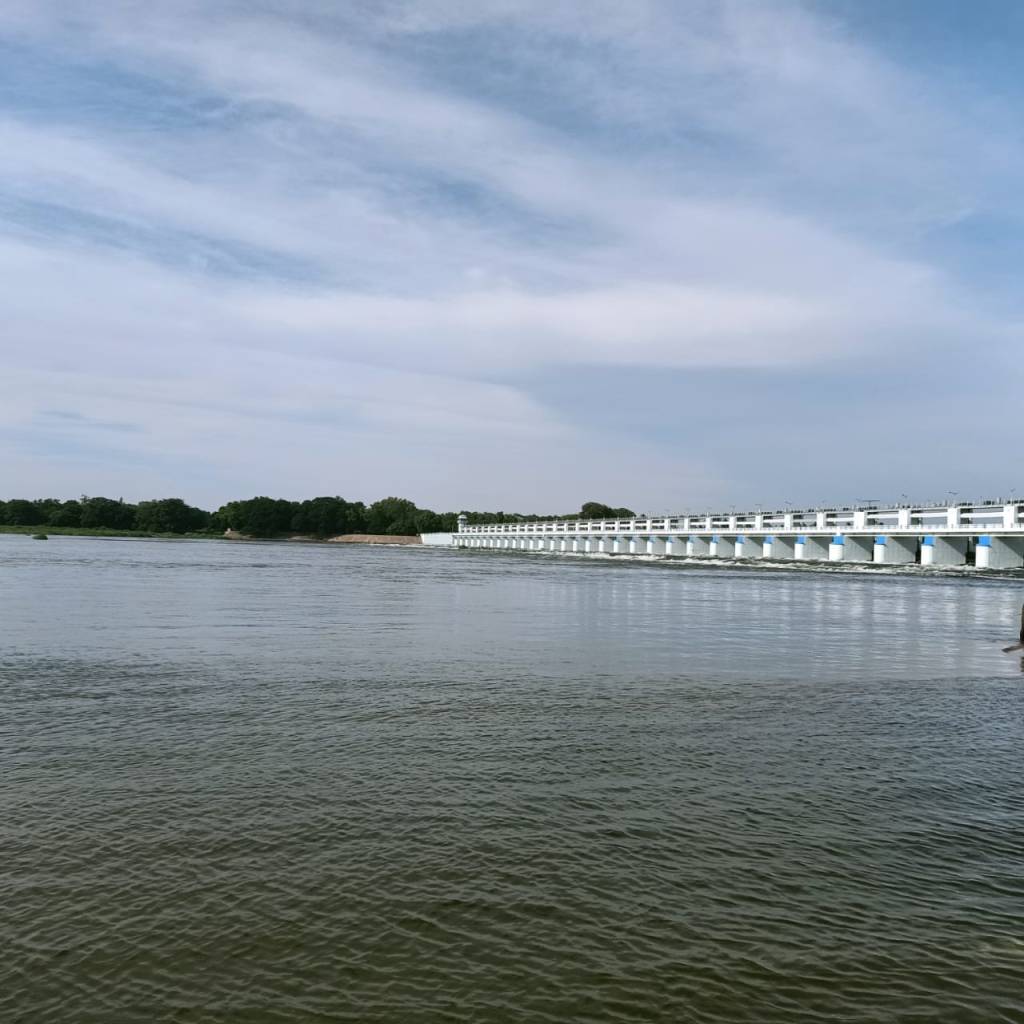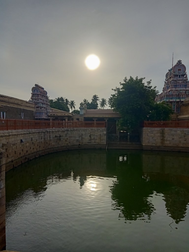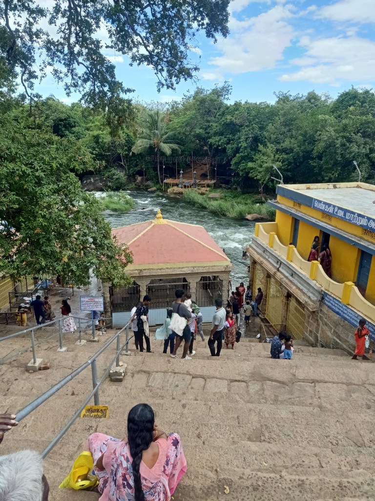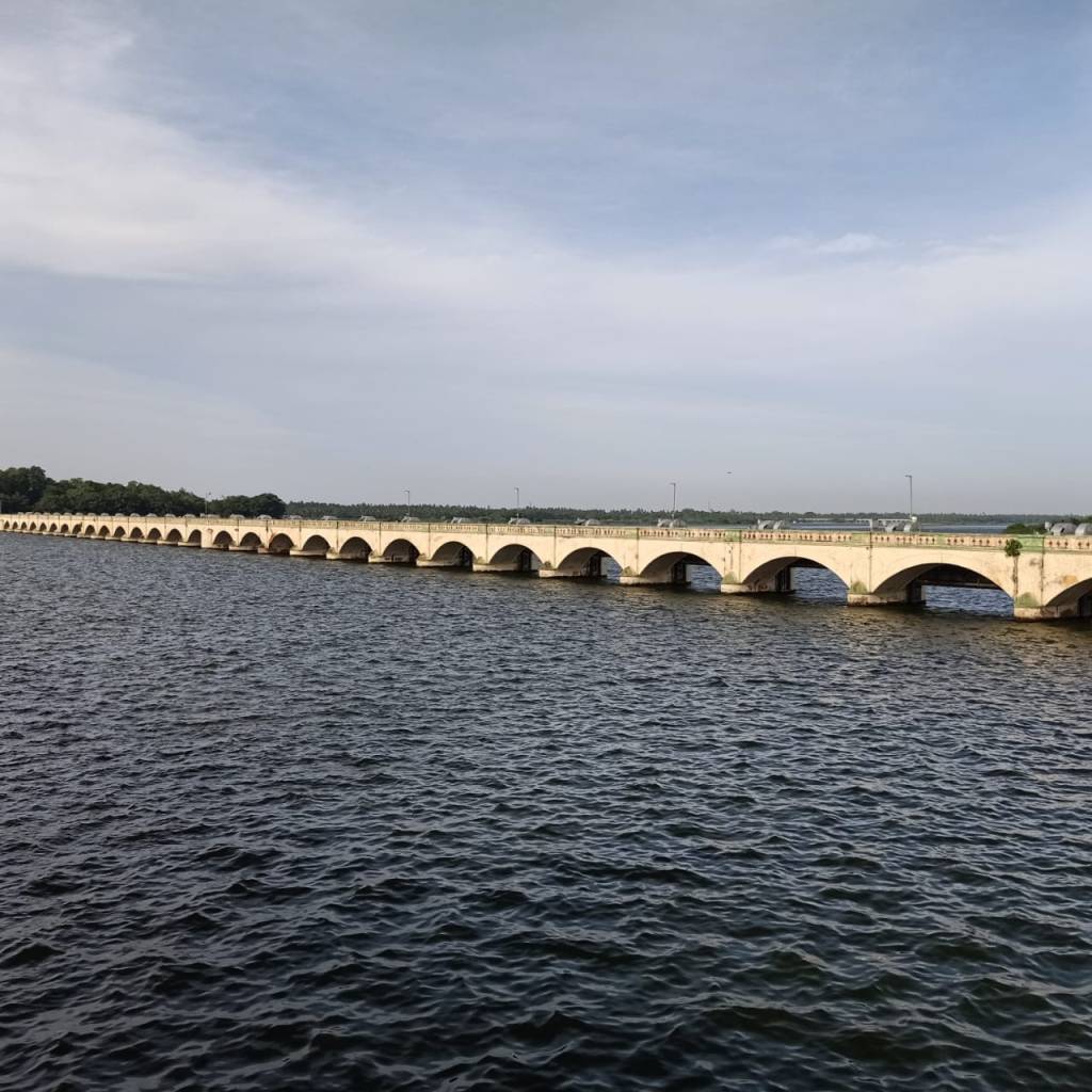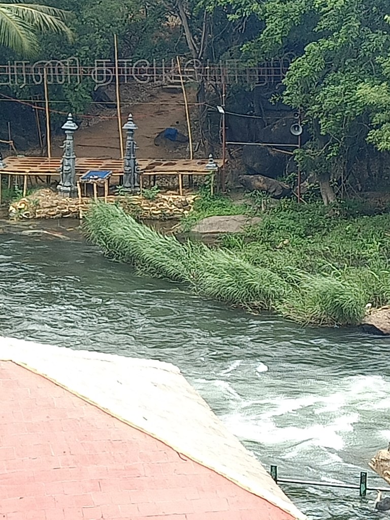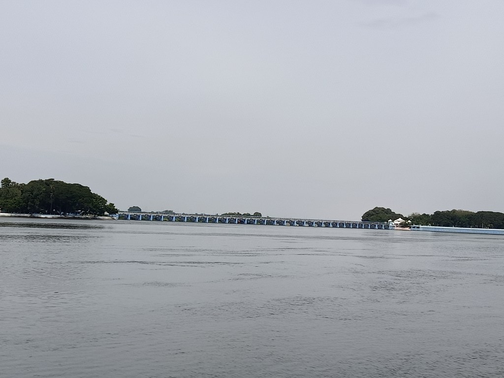 After spending two days in Srirangam, a trip to Kallanai Dam can be quite exciting. This dam is about 20 km away from Srirangam built sometime in 2nd century is a working dam from centuries ago. It can be approached through roads running along either one of the banks of Cauvery, although at the time of our visit we used the southern bank, as the movement along the northern bank was not allowed due to the construction of a new bridge. Upon reaching the dam one can park their vehicle at one of the two designated spots on either side of the river. At Kallanai, one can see that the waters branch in the southern direction, eastern direction and the excess is directed through the north-easterly direction to Kollidam. Two designated swimming pools (basically, a part of the flowing river is surrounded by grills with concrete flooring), on either side of the Vennar (the river that proceeds to the east and located in the middle) enables one to enjoy the river (check to ensure that there is water flowing here before visiting). This is the eastern most tip of the island of Srirangam.