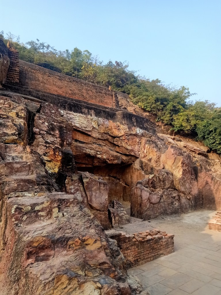 Only the basic ruins are present. Here Ajathasatru imprisoned his father to stop him from associating with Buddha. Bimbisara is said to have chosen the site for the jail as he could look at the peak of GRIDHAKUTA or vultures peak. Buddha was said to meditate in this peak. An old man was sitting in front of the structure and recanted the story of Bimbisara, Ajathasatruand how Ajathasatru repented imprisoning his father.