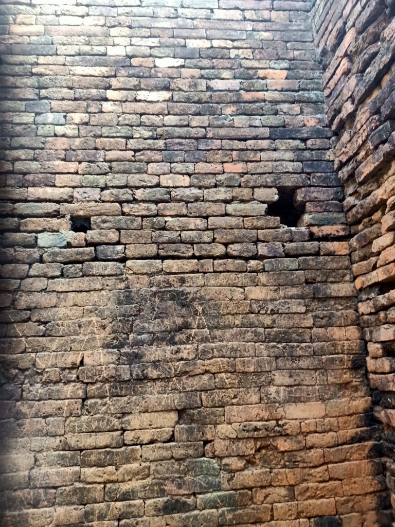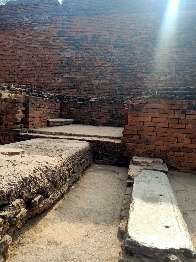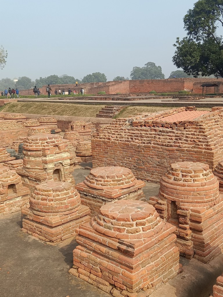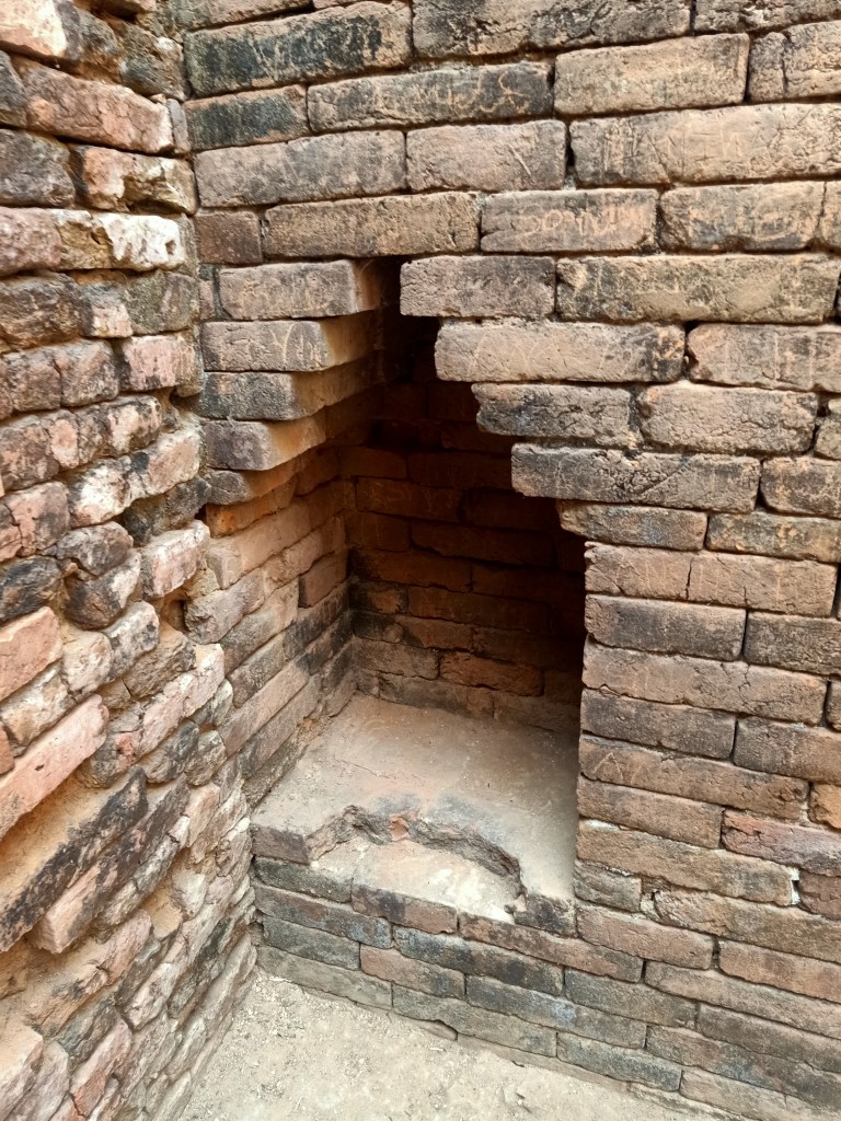 The final destination was the Majestic NALANDA ruins. Oh what a magnificent sight. One cannot imagine what kind of energy would have been around the university in its hay days. The start of the university was from the times of Buddha. One monk had 5 students under him and had a hut to live. This is how it started. Later by the time of Kumaragupta of Gupta dynasty (427 CE), who commissioned the construction of NALANDA UNIVERSITY, there were 2000 monks and 10000 students. It received grants from Sri Lanka, Thailand , Indonesia and so on. It was very difficult to enroll in the university and the guide told us that those interested in joining this University were interviewed by the gate keepers and percentage selection was 10%. . Later Harshavardhana and Dharmapala repaired, refortified it. Heiun Tsang visited during Harsha’s reign and left enormous amounts of information regarding Nalanda. Law, Medicine, Astronomy and Philosophy were the main subjects at Nalanda. Around 1200, Bhaktiyar Khilji destroyed and set on fire to the library housing 90000 scrolls. The ruins were then buried or got buried. Excavation began by 1915 and today ASI has excavated about 15 monasteries. Each monastery is well laid out with rooms for the students, a kitchen, granary, temple, well. A well laid out plumbing system could also be seen. The main picture we see of the Nalanda ruin is an open air theatre with small temples. There are many stupas which denote the place where a monk who taught there was buried. The most disheartening thing is to see the remnants of the great fire etched on the walls as carbon.